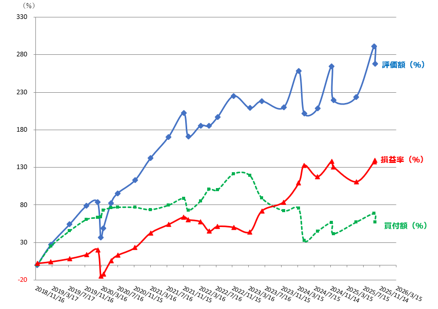 (2018年の損益0%からスタート、買付額(元本+売った後の再投資を含む)と評価額の金額の増えた率(金額は非公開)、損益率の推移です。)